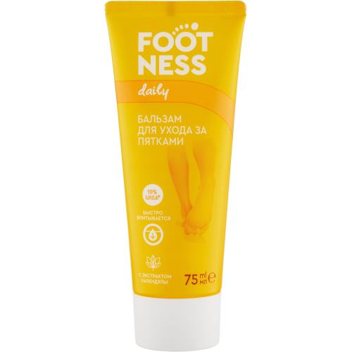Бренд FOOTNESS - средства для ухода за кожей ног Внешний вид и свойства: Кремообразная текстура белого цвета с легким, освежающим цветочным ароматом. Бальзам для ухода за пятками Footness эффективно увлажняет и питает кожу пяток, придавая ей мягкость и гладкую текстуру. Приятная текстура и свежий аромат. Быстро впитывается и не оставляет жирной пленки. Активные ингредиенты: 10% Urea (экстракт мочевины), Экстракт Ромашки, Экстракт Календулы, Аллантоин, Молочная кислота. -10% мочевина (UREA): Способствует предотвращению сухости кожи и обеспечивает увлажнение. -Экстракт календулы и аллантоин: Смягчают и стимулируют регенерацию тканей.Действие