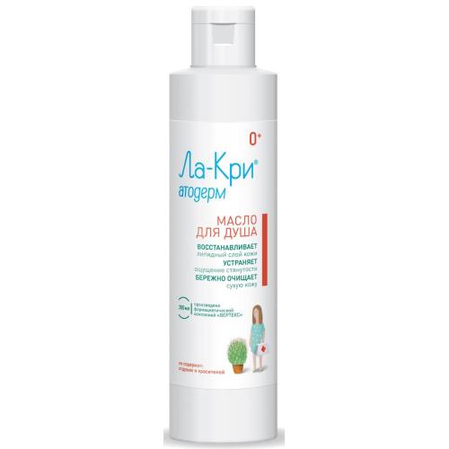 Бренд La-Kri (ЛА-КРИ) Масло для душа ЛА-КРИ® АТОДЕРМ детское - разрешено к применению у детей с рождения. Очищающее средство для восстановления липидного слоя раздраженной, атопичной и очень сухой кожи. -бережно очищает сухую кожу и устраняет ощущение стянутости -способствует удержанию влаги внутри -нейтральное значение pH. Активные компоненты: Производные масла оливы восстанавливают барьерную функцию кожи, увлажняют и питают ее. Экстракт солодки обладает противоаллергическим и противовоспалительным действием. Пантенол - провитамин В5, производное кальция пантотената. Обладает регенерирующим и смягчающим действием. Аллантоин смягчает роговой слой кожи, таким образом, стимулируя удаление отмерших клеток и активирует обновление клеток. Персика масло имеет легкую консистенцию, хорошо впитывается и обеспечивает проникновение действующих веществ. Обладает противовоспалительным, регенерирующим, увлажняющим, смягчающим и тонизирующим действием. Преимущества • Сбалансированный состав масла для душа обеспечивает высокую эффективность восстановления липидного слоя кожи и обеспечивает пролонгированный эффект • pH нейтрален, не вызывает раздражения кожи и устраняет ощущение стянутости. • Активный компонент экстракт солодки оказывает противовоспалительное и обволакивающие действие • Натуральный безопасный состав: не содержит отдушек и красителей, разрешено к применению у детей с первых дней жизни • Эффективное средство в среднем ценовом сегментеПоказания к применению