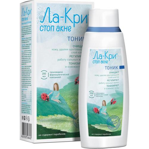 Нанести небольшое количество тоника на ватный тампон. Очисть кожу лица и шеи, избегая области вокруг глаз. Для достижения наилучшего результата, рекомендуется повторить процедуру. Использовать 2 раза в день утром и вечером. Рекомендуется применять в комплексе с пенкой для умывания и крем-гелем матирующим ЛА-КРИ СТОП АКНЕ.Форма выпуска