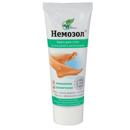 Крем косметический от мозолей и натоптышей, с противогрибковым действием «НЕМОЗОЛ» Обеспечивает избавление от натоптышей и мозолей после 2–3-х применений. Прекрасно питает и защищает кожу стоп. Эффективно смягчает кожу и предупреждает образование трещин и слоистых образований. Препятствует развитию отеков. Предотвращает появление неприятного запаха, сохраняет ощущение свежести и чистоты в течении всего дня. НАЗНАЧЕНИЕ: – при мозолях и натоптышах – наличие в составе мочевины, салициловой и молочной кислот, экстракта чеснока способствует размягчению грубых кожных наслоений и корня мозоли, отшелушиванию эпидермиса; – при грибковом поражении и неприятном запахе стоп – комплекс экстрактов чистотела, бергамота, дуба, чеснока, листьев березы в сочетании с винилином, триклозаном и эфирными маслами лимона и чайного дерева оказывает антимикробное действие, препятствует появлению неприятного запаха; – для улучшения состояния кожи стоп – облепиховое масло, экстракт прополиса, экстракты растений прекрасно питают и защищают кожу, уменьшают покраснение и припухлость. Основными преимуществами данного крема являются мягкое снятие ороговевшего слоя, что намного эффективнее и безопаснее аппаратного педикюра (особо рекомендуется больным с сахарным диабетом (диабетическая стопа), при склонности к образованию трофических изменений на коже) и продолжительное воздействие (оказывает противогрибковое и антимикробное действие, блокирует появление неприятного запаха на весь рабочий день). Крем содержит натуральные компоненты, которые предотвращают появление неприятного запаха, сохраняют ощущение свежести и чистоты в течение всего дня. Крем питает и увлажняет кожу стоп, смягчает огрубевшие участки. Способствует профилактике образования натоптышей и трещин на коже стоп. Входящие в состав натуральные кислоты способствуют быстрому, мягкому и безопасному избавлению от мозолей и натоптышей.Действие