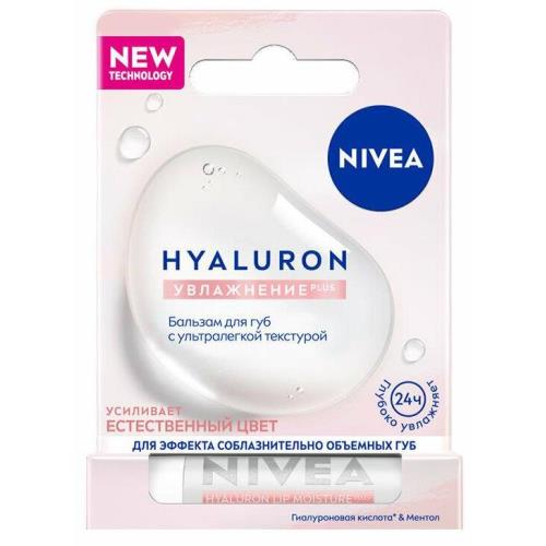 Попробуйте новинку - бальзам для губ с ультралегкой текстурой HYALURON Увлажнение PLUS от NIVEA с гиалуроновой кислотой и ментолом. Обогащённая Гиалуроновой кислотой* и ментолом обволакивающая текстура бальзама наполняет губы влагой, подчеркивает естественный нежно-розовый цвет и придает соблазнительный объем с эффектом увеличенных губ. Мгновенно тая, бальзам дарит губам свежий, цветочно-фруктовый аромат, ухаживает и восстанавливает кожу, увлажняет 24 часа,** не оставляя ощущения липкости.