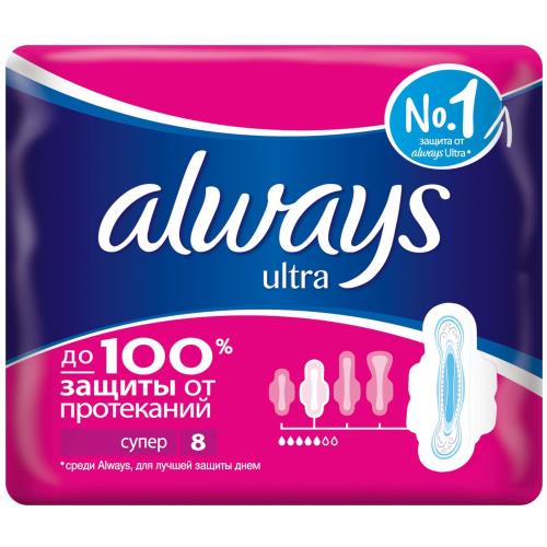 Always Ultra Super с крылышками предлагают до 100% защиты для вашей уникальной фигуры и интенсивности выделений. Идеально подходят при незначительных выделениях и размере нижнего белья L, при умеренных выделениях и размере белья M и L или при интенсивных выделениях и размере белья S. Гигиенические прокладки Always Ultra имеют защитные контуры Secureguard и содержат гель, который впитывает и удерживает влагу, помогая предотвращать протекания.