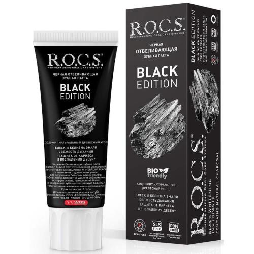 Черная отбеливающая зубная паста R.O.C.S. BLACK EDITION для взрослых содержит комплекс MINERALIN® BLACK, представляющий собой запатентованную комбинацию ингредиентов: натуральный протеолитический фермент бромелаин, ксилит, глицерофосфат кальция, хлорид магния. Уникальная формула зубной пасты выполнена на основе новейшей многоступенчатой очищающей системы, содержащей специальные очищающие полирующие гранулы. Благодаря особой структуре гранулы на начальном этапе чистки зубов качественно, быстро и безопасно удаляют мягкий зубной налет.
