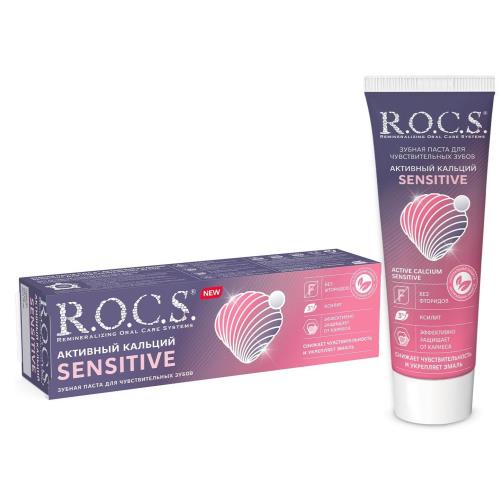 Паста зубная R.O.C.S. «Активный Кальций SENSITIVE» имеет низкую абразивность и содержит сбалансированный минеральный состав, благодаря чему она рекомендована для регулярного ежедневного использования лицам с дефектами эмали и повышенной чувствительностью зубов.
