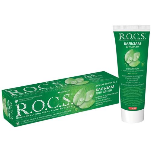 Зубная паста R.O.C.S. "Бальзам для десен" эффективно защищает десны от кровоточивости и воспаления, питает эмаль зубов минералами и препятствует размножению бактерий зубного налета.
