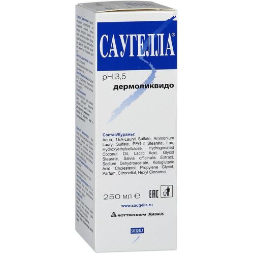 Саугелла Дермоликвидо нормализует физические характеристики, биохимические процессы, поддерживает баланс между микроорганизмами во влагалище, препятствуя размножению патогенных микроорганизмов (в т. ч. возбудителей молочницы и бактериального вагиноза). Профилактирует вагинальный дискомфорт (зуд, раздражение, покраснение, увеличение выделений). Содержит экстракт шалфея лекарственного, который оказывает дезинфицирующее и противовоспалительное действие. рН 3,5 жидкого мыла обеспечивает и поддерживает физиологическое значение рН у женщин детородного возраста, гарантируя естественную ежедневную защиту.