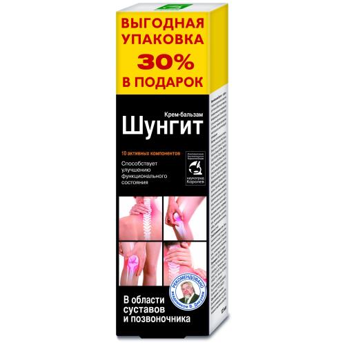 Шунгит крем-бальзам/суставов - сероватая лёгкая субстанция (кремообразная) со специфическим запахом Шунгит - эффективное натуральное средство для тела в области суставов на основе уникального природного минерала шунгит. Шунгит - уникальный природный минерал древнейшего происхождения (около 2 млрд. лет). Обладает особым образом организованной углеродистой кристаллической структурой. Содержит природные фуллерены - самый мощный и устойчивый антиоксидант с выраженными лечебными свойствами. Открытие фуллеренов в 1996 году было удостоено Нобелевской премии. По результатам много-численных клинических исследований, шунгит эффективен при более чем 50 заболеваниях. Особо высокую активность проявляет при заболеваниях опорно двигательного аппарата: артритах, радикулитах, артрозах, остеохондрозах, подагре. Единственное в мире месторождение шунгита находится в Карелии близ поселка Шуньга, где в 1719 году Петром I был основан курорт "Марциальные воды". •Мумиё- от греч. "сохраняющее тело". Сложное по химической структуре природное образование, добываемое в горах, уникальный природный биостимулятор. Более трех тысяч лет широко используется в медицине. Стимулирует восстановительные процессы в суставах и пролиферацию клеток соединительных тканей, обладает противо-отечным, противовоспалительным, антитоксическим, иммуностимулирующим, обще-укрепляющим действием. Содержит комплекс органических веществ и около 50 минеральных веществ (в том числе, кальций, фосфор, магний, хром, марганец, медь, серебро, кремний), бамино- кислот, витамины, эфирные масла, смолоподобные вещества. •Гидролизат коллагена является строительным материалом для естественного восстановления тканей опорно двигательного аппарата, способствует ре-генерации и укреплению хрящей, связок, повышает их прочность и упругость, улучшает подвижность суставов и позвоночника. •Женьшень - от китайского "корень жизни". Многолетнее лекарственное растение семейства аралиевых. В качестве мощного адаптогена и биостимулятора корень женьшеня широко применяется в медицине. Повышает жизненный тонус организма, замедляет возрастные изменения, активно препятствует старению опорно-двигательного аппарата. Содержит гликозиды, биологически активные полиацетилены, алкалоиды, крахмал, пектиновые и дубильные вещества, смолы, витамин С, фосфор, серу, германий, макро- и микроэлементы, тритерпеновые сапонины и многие другие вещества. •Экстракты и масла лекарственных растений обеспечивают суставы питательными веществами, улучшают кровоснабжение и обмен веществ в околосуставных тканях, стимулируют восстановительные процессы в хряще, повышают качество синовиальной жидкости. Оказывают противовоспалительное, противо- отечное, анальгезирующее действие.Действие