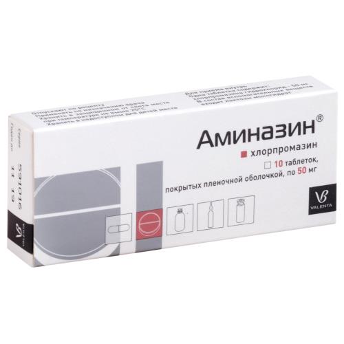 При одновременном применении препарата Аминазин® с дру-гими препаратами, оказывающими угнетающее влияние на ЦНС (средства для общей анестезии, наркотические анальгетики, этанол (алкоголь) и содержащие его препараты, барбитураты, транквилизаторы и др.), возможно усиление депрессии ЦНС, а также угнетение дыхания. Барбитураты могут снизить концентрацию хлорпромазина в сыворотке крови. Нежелательно продолжительное сочетание с анальгетиками и антипиретиками - возможно развитие гипертермии. Назначение хлорпромазина совместно с трициклическими антидепрессантами, мапротилином или ингибиторами моноа- миноксидазы (МАО) увеличивают риск развития нейролепти-ческого злокачественного синдрома; Производные фенотиазина являются антагонистами действия эпинефрина и других симпатомиметиков и противоэпилепти- ческих препаратов (снижение порога судорожной готовности). При применении хлорпромазина в сочетании с препаратами для лечения гипертиреоза повышается риск развития агранулоцитоза. При применении хлорпромазина в сочетании с препаратами, вызывающими экстрапирамидные реакции, возможно увеличение частоты и тяжести экстрапирамидных нарушений. Производные фенотиазина повышают гипотензивное действие средств для анестезии, блокаторов «медленных» кальциевых каналов и других гипотензивных средств и тразодона. Хлорпромазин снижает гипотензивное действие нейронных адренобло- каторов, таких, как гуанетидин, эффекты амфетаминов, клони- дина. При одновременном применении хлорпромазина и ингибиторов ангиотензин пре вращающего фермента (АПФ) возникает тяжелая ортостатическая гипотензия. Одновременное применение бета-адреноблокаторов и хлорпро-мазина увеличивает риск артериальной гипотензии, в том числе ортостатической, вследствие суммации сосудорасширяющего эффекта хлорпромазина и уменьшения сердечного выброса, вызываемого бета-блокаторами. Одновременное применение бета-адреноблокаторов и хлорпро-мазина повышает риск развития необратимой ретинопатии, поздней дискинезии. Одновременное применение хлорпромазина с антиаритмичес- кими ЛС 1а и Ш классов, бета-блокаторами, некоторыми блока-торами кальциевых каналов, ЛС наперстянки, пилокарпином, антихолинэстеразными ЛС, может сопровождаться брадикарди-ей и повышенным риском развития желудочковой аритмии, включая «пируэт». При сочетании указанных ЛС с хлорпромази-ном рекомендуется ЭКГ -мониторинг. Одновременное применение хлорпромазина с нитратами увели-чивает риск развития ортостатической гипотензии вследствие усиления вазодилаторного эффекта. Одновременное применение хлорпромазина с тиазидными диуретиками способствует усилению гипонатриемии. Одновременное применение хлорпромазина с бромокриптином повышает концентрацию в плазме пролактина и препятствует действию бромокршггина. Одновременное применение с антимускариновыми ЛС может усугублять развитие антихолинергических побочных эффектов (задержку мочи, провокацию острого приступа глаукомы, сухость во рту, запоры и т.д.). Антихолинергическими свойства-ми обладают различные ЛС атропина, трициклические антидеп-рессанты, Н1 -гистами но блокаторы, анти мускариновые, проти- вопаркинсонические антихолинергические спазмолитики, дизопирамид, фенотиазиновые нейролептики и клозапин. При применении хлорп