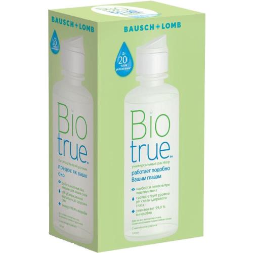 Раствор Biotrue облегчает ношение линз, поскольку он работает подобно Вашим глазам. Раствор Biotrue соответствует уровню pH слезы здорового глаза и содержит природное увлажняющее вещество-Как показывают научные исследования, проведенные в нашей лаборатории, раствор Biotrue помогает сохранить линзы увлажненными до 20 часов.