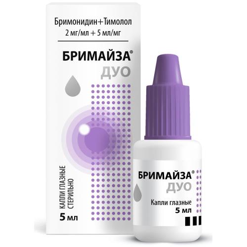 Препарат Бримайза Дуо – комбинированное лекарственное средство, содержащее в своем составе 2 действующих вещества: бримонидин – адреномиметик, оказывающий стимулирующее действие на альфа2-адренорецепторы, и тимолол – блокатор бета-адренорецепторов. Оба действующих вещества снижают внутриглазное давление (ВГД) за счет сочетанного взаимодействия, приводя к значительно более выраженному гипотензивному эффекту по сравнению с эффектом каждого из компонентов в отдельности. Бримонидин – агонист альфа-адренергических рецепторов, причем он обладает в 1000 раз большей селективностью в отношении альфа2-адренорецепторов по сравнению с альфа1-адренорецепторами. Селективность выражается в отсутствии мидриаза и вазоконстрикции сосудов микроциркуляторного русла. Гипотензивное действие бримонидина обеспечивается за счет снижения образования внутриглазной жидкости и повышения ее оттока по увеосклеральному пути.