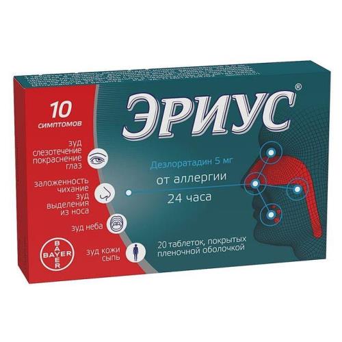 Антигистаминный препарат длительного действия. Является первичным активным метаболитом лоратадина. Ингибирует каскад реакций аллергического воспаления, в том числе высвобождение провоспалительных цитокинов, включая интерлейкины ИЛ-4, ИЛ-6, ИЛ-8, ИЛ-13, высвобождение провоспалительных хемокинов (RANTES), продукцию супероксидных анионов активированными полиморфноядерными нейтрофилами, адгезию и хемотаксис эозинофилов, выделение молекул адгезии, таких как Р-селектин, IgE-опосредованное высвобождение гистамина, простагландина D2 и лейкотриена С4. Таким образом, предупреждает развитие и облегчает течение аллергических реакций, обладает противозудным и противоэкссудативным действием, уменьшает проницаемость капилляров, предупреждает развитие отека тканей, спазма гладкой мускулатуры. Препарат не оказывает воздействия на центральную нервную систему, практически не обладает седативным эффектом (не вызывает сонливости) и не влияет на скорость психомоторных реакций. Не вызывает удлинения интервала QT на ЭКГ. Действие лекарственного препарата Эриус® начинается в течение 30 минут после приема внутрь и продолжается в течение 24 часов.Фармакокинетика