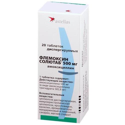 Флемоксин Солютаб - бактерицидный антибиотик широкого спектра действия из группы полусинтетических пенициллинов. Нарушает синтез пептидогликана (опорный полимер клеточной стенки) в период деления и роста, вызывает лизис бактерий. Активен в отношении грамположительных и грамотрицательных микроорганизмов, таких как Streptococcus pyogenes, Streptococcus pneumoniae, Clostridium tetani, Clostridium welchii, Neisseria gonorrhoeae, Neisseria meningitidis, Staphylococcus aureus (не вырабатывающих бета-лактамазы), Bacillus anthracis, Listeria monocytogenes, Helicobacter pylori. Менее активен в отношении Enterococcus faecalis, Escherichia coli, Proteus mirabilis, Salmonella typhi, Shigella sonnei, Vibrio cholerae. He активен в отношении микроорганизмов, продуцирующих бета-лактамазы, Pseudomonas spp., индол-положительных Proteus spp., Serratia spp., Enterobacter spp. Штаммы, продуцирующие пенициллиназу, резистентны к действию амоксициллина.