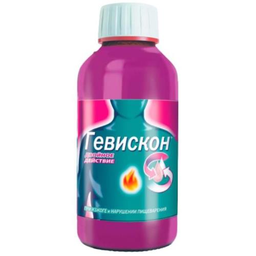 Гевискон® Двойное Действие является комбинацией алгината и антацидов (кальция карбоната и натрия гидрокарбоната). При приеме внутрь действующие вещества препарата быстро реагируют с кислым содержимым желудка. При этом образуется гель алгината со значением pH, близким к нейтральному. В течение 3 мин гель образует защитный барьер на поверхности содержимого желудка, препятствуя возникновению гастроэзофагеального рефлюкса (обратному забросу содержимого желудка в пищевод) на период до 4 ч. В тяжелых случаях рефлюкса (регургитации) гель попадает в пищевод, опережая остальное желудочное содержимое, где уменьшает раздражение слизистой оболочки пищевода. Кальция карбонат быстро нейтрализует соляную кислоту желудочного сока, облегчая ощущение изжоги. Этот эффект усиливается благодаря наличию в составе препарата натрия гидрокарбоната, который также обладает нейтрализующим действием. Общая кислотонейтрализующая активность препарата в минимальной дозе 10 мл составляет приблизительно 10 мЭкв.