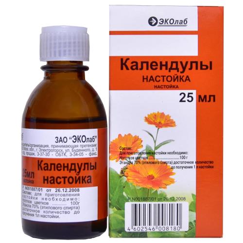 Применяют наружно как антисептическое и противовоспалительное средство при порезах, ушибах, экземах, местно - для полоскания горла при воспалительных заболеваниях глотки (тонзиллиты, фарингиты, ларингиты, фаринголарингиты) и слизистой оболочки полости рта (стоматит, гингивит, пародонтит). Внутрь настойку календулы применяют при холецистите, холангите.