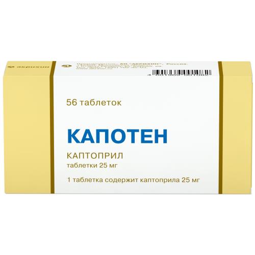 Препарат Капотен® является ингибитором ангиотензинпревращающего фермента (АПФ). Подавляет образование ангиотензина II и устраняет его сосудосуживающее действие на артериальные и венозные сосуды. Уменьшает общее периферическое сосудистое сопротивление, уменьшает постнагрузку, снижает артериальное давление. Уменьшает преднагрузку, снижает давление в правом предсердии и малом круге кровообращения. Уменьшает выделение альдостерона в надпочечниках. Максимальный гипотензивный эффект наблюдается в течение 60-90 минут после приема внутрь. Степень снижения артериального давления одинакова при положении пациента «стоя» и «лежа». Эффективность и безопасность применения каптоприла у детей не установлены. В литературе описан ограниченный опыт применения каптоприла у детей. Дети, особенно новорожденные, могут быть более подвержены развитию гемодинамических побочных эффектов. Отмечались случаи развития чрезмерного, длительного и непредсказуемого повышения артериального давления, а также связанных с ним осложнений, включая олигурию и судороги.Фармакокинетика
