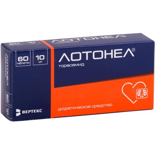 Препарат Лотонел применяют строго по назначению врача. Пациенты с повышенной чувствительностью к сульфаниламидам и производным сульфонилмочевины могут иметь перекрестную чувствительность к торасемиду. Пациентам, получающим высокие дозы торасемида в течение длительного периода, во избежание развития гипонатриемии, гипокалиемии и метаболического алкалоза рекомендуется диета с достаточным содержанием поваренной соли и применение препаратов калия. Риск гипокалиемии наибольший у пациентов с циррозом печени, усиленным диурезом, при недостаточном потреблении электролитов с пищей, а также при одновременном применении кортикостероидов или АКТГ. Повышенный риск развития нарушений водно-электролитного баланса отмечается у пациентов с почечной недостаточностью. В ходе курсового лечения препаратом Лотонел® необходимо периодически контролировать содержание электролитов в плазме крови (в т.ч. натрия, кальция, калия, магния), кислотно-основное состояние, концентрацию остаточного азота, креатинина, мочевой кислоты и проводить при необходимости соответствующую коррекционную терапию (с большей кратностью у пациентов с частой рвотой и на фоне парентерального введения жидкостей). У пациентов с развившимися водно-электролитными нарушениями, гиповолемией или преренальной азотемией данные лабораторных анализов могут включать: гипер- или гипонатриемию, гипер- или гипохлоремию, гипер- или гипокалиемию, нарушения кислотно-щелочного баланса и повышение концентрации мочевины в плазме крови. При возникновении указанных отклонений от лабораторных показателей необходимо прекратить прием препарата Лотонел® до восстановления нормальных значений, а затем возобновить лечение препаратом Лотонел® в меньшей дозе. При появлении или усилении азотемии и олигурии у пациентов с тяжелыми прогрессирующими заболеваниями почек рекомендуется приостановить лечение препаратом Лотонел®. Подбор режима дозирования пациентам с асцитом на фоне цирроза печени нужно проводить в стационарных условиях (нарушения водно-электролитного баланса могут повлечь за собой развитие печеночной комы). Данной категории пациентов показан регулярный контроль электролитов плазмы крови. Применение препарата Лотонел® может обусловливать обострение подагры. У пациентов с сахарным диабетом или со сниженной толерантностью к глюкозе требуется периодический контроль концентрации глюкозы в крови и моче. У пациентов в бессознательном состоянии, с доброкачественной гиперплазией предстательной железы, сужением мочеточников необходим контроль диуреза в связи с возможностью острой задержки мочи. У пациентов с заболеваниями ССС, особенно принимающих сердечные гликозиды, вызванная диуретиками гипокалиемия может стать причиной развития аритмий. Влияние на способность к управлению транспортными средствами и механизмами. В период лечения пациенты должны воздерживаться от управления транспортными средствами и занятий другими потенциально опасными видами деятельности, требующими повышенной концентрации внимания и быстроты психомоторных реакций (риск развития головокружения и сонливости).Форма выпуска