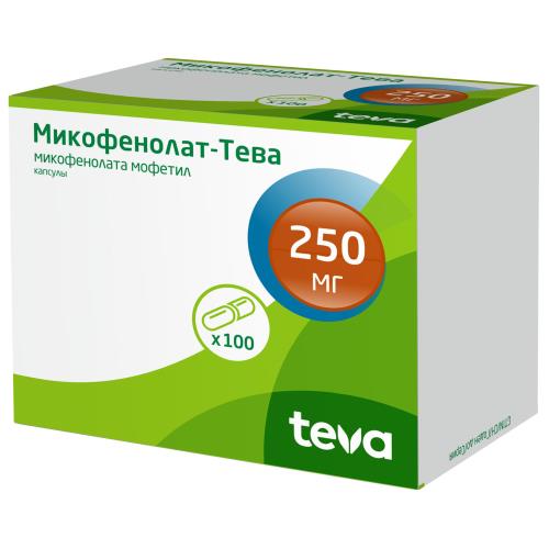 СоставВ 1 капсуле содержится: активное вещество микофенолата мофетил 250,0 мг; вспомогательные вещества: крахмал прежелатинизированный 30,0 мг, повидон 7,0 мг, кроскармеллоза натрия 10,0 мг, магния стеарат 3,0 мг; желатиновая капсула: крышка (индигокармин (Е132) 0,011 мг, титана диоксид (Е171) 0,671 мг, желатин q.s. 30,4 мг), корпус (краситель железа оксид красный (Е172) 0,169 мг, краситель железа оксид желтый (Е172) 0,068 мг, титана диоксид (Е171) 0,608 мг, желатин q.s. 45,6 мг), чернила (шеллак 24-27 %, краситель железа оксид черный (Е172) 24-28 %, пропиленгликоль 51,95-44,9 %, калия гидроксид 0,05-0,1 %).