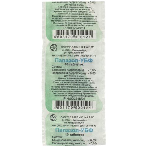 1 таблетка содержит: Активные вещества: бендазола гидрохлорид 30 мг, папаверина гидрохлорид 30 мг; Вспомогательные вещества: лактоза (сахар молочный) - 51,2 мг, повидон (поливинилпирролидон) - 4 мг, крахмал картофельный - 2,4 мг, тальк - 1,2 мг, кальция стеарат - 1,2 мг.Лекарственная форма