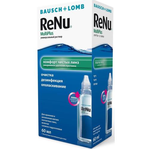 Многофункциональный раствор ReNu MultiPlus компании Bausch+Lomb предназначен для химической (не термической) дезинфекции, ежедневной очистки, ежедневного удаления белковых отложений, смачивания линз, споласкивания и хранения любых мягких контактных линз, включая силикон-гидрогелевые, рекомендованные врачом.