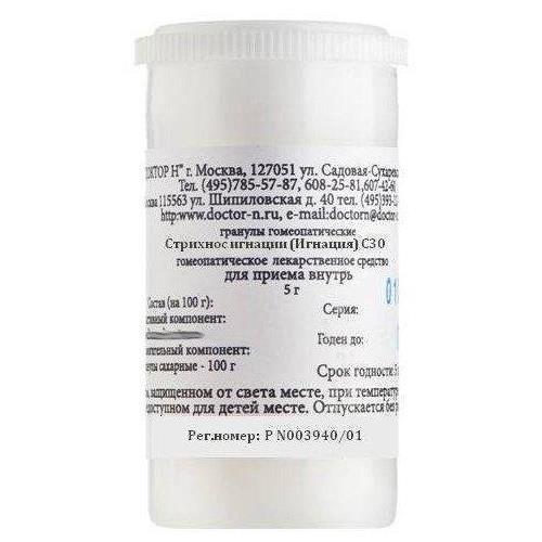 Состав (на 100 г): активный компонент: Strychnos ignatii (Ignatia) Стрихнос игнации (Игнация) C6 - 1,0 г вспомогательный компонент: гранулы сахарные - 100 г