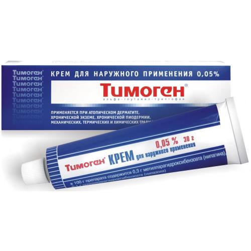 Препарат наносят тонким слоем на пораженное место 1-2 раза в сутки (утром и вечером). Рекомендуемая суточная доза - 2 г крема (1000 мкг тимогена). Полоса крема из тубы диаметром 5 мм длиной 4 см имеет массу 1 г.