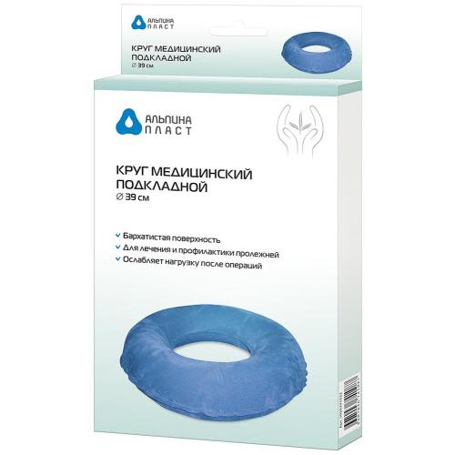 Подкладной медицинский круг – это самое доступное, безопасное и эффективное средство профилактики и борьбы с пролежнями и некрозом тканей тела человека. Подкладной круг также используется для восстановления больного после операций на прямой кишке, при ушибе копчика и для ослабления нагрузки на промежности при геморрое. Использование круга Альпина Пласт не вызывает дискомфорт у пациента - круг подкладывается непосредственно под участок кожи, подвергающийся давлению. Степень жесткости подкладного круга легко регулируется, а бархатистая поверхность способствует вентиляции кожи непосредственно в местах соприкосновения. Соответствует требованиям ТУ 9398-018-17707123-2013 Регистрационное удостоверение №РЗН 2015/2669 от 08.07.2016 г. Не подлежит обязательной сертификации и декларированию в РФ. Гарантийный срок годности – 5 лет со дня изготовления. Диаметр изделия 390±5 мм, выдерживает нагрузку не менее 150 кг.Показания к применению
