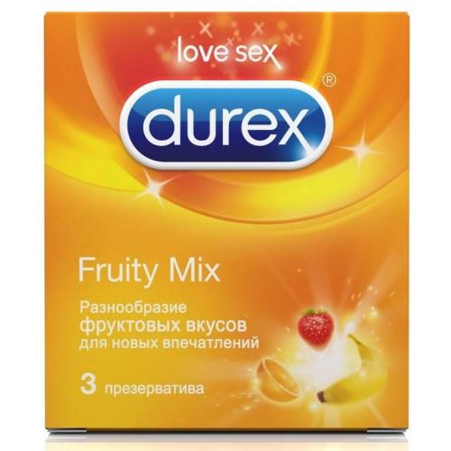 Презервативы Durex Fruity Mixt со вкусом апельсина, банана и клубники. Цветные презервативы обработаны бесспермицидной смазкой. Прозрачные, особой формы, с накопителем.