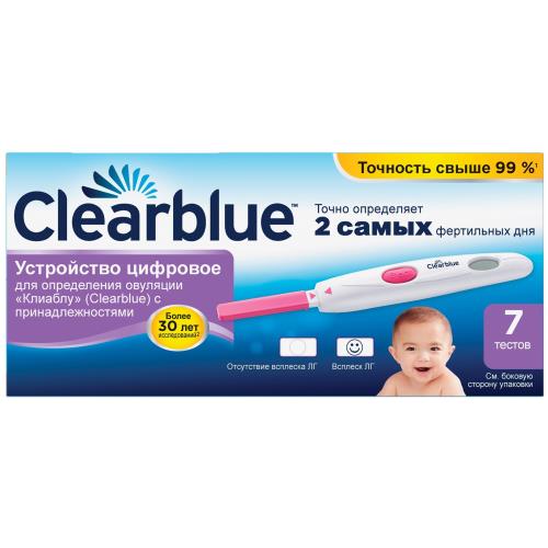 Это простое для считывания цифровое устройство для определения овуляции «Клиаблу» (Clearblue) с точно определяет 2 наиболее фертильных дня в каждом цикле, благодаря чему вы можете максимально увеличить свои шансы забеременеть естественным путем. В каждом цикле есть всего несколько дней, в которые женщина может забеременеть, — несколько дней до овуляции и сам день овуляции. Но циклы, как и время овуляции, изменчивы, а это означает, что каждая вторая женщина может предпринимать попытки зачать в неподходящее время цикла.1 Эти простые тесты в пробе мочи имеют точность свыше 99 % при выявлении повышения главного гормона фертильности (лютеинизирующего гормона) за 24–36 часов до овуляции. При обнаружении всплеска ЛГ на цифровом дисплее появляется четкий «смайлик», благодаря которому вы поймете, что текущий и следующий день — лучшие два дня для того, чтобы попытаться зачать ребенка.Показания к применению