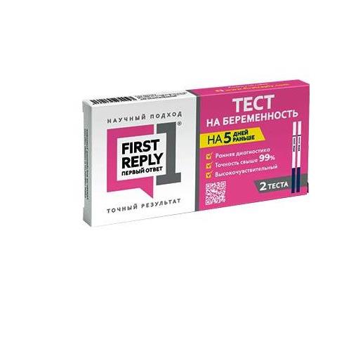 FIRST REPLY (ПЕРВЫЙ ОТВЕТ) настолько чувствителен, что большинство женщин имеют достаточно «гормона беременности» для определения за 4 дня до ожидаемой менструации. В клинических испытаниях тест FIRST REPLY (ПЕРВЫЙ ОТВЕТ) определил гормон беременности у 69% женщин за 4 дня до ожидаемой менструации, у 83% за 3 дня до ожидаемой менструации, у 93% женщин за 2 дня до ожидаемой менструации и у 93% за один день до ожидаемой менструации. С первого дня задержки менструации точность определения свыше 99%.