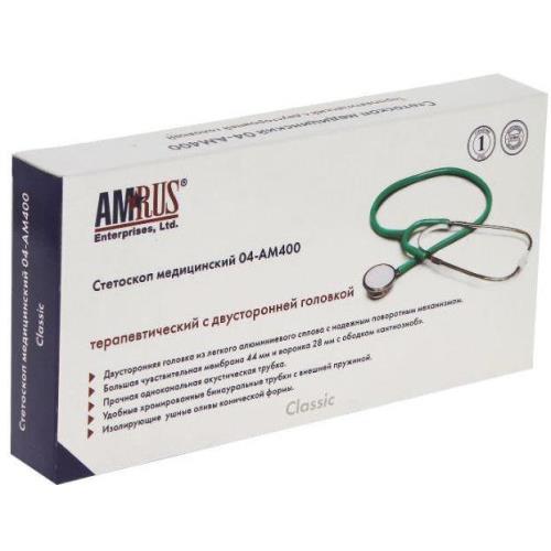 Характеристики: Модель - 04-АМ400; Вид - терапевтический; Головка - 2 сторонняя облегченная из алюминия; Мембрана - ПВХ, O 44 мм; Колокол - есть, O 28мм с резиновым кольцом (антиозноб); Трубки оголовья - съемные хромированные; Стягивающая пружина - наружная; Ушные оливы - виниловые конические твердые белого цвета; Звукопроводящая трубка - толщина 0,9 см, из ПВХ, длиной 55 см. Вес брутто - 120г Габариты коробки (д*ш*в) - 19,5*10*2,8 см