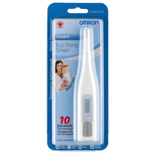 Электронный термометр Omron Eco Temp Smart (МС-341-RU) за 10 секунд измерит температуру тела. Прибор можно использовать оральным и ректальным способами, а также под мышкой. По окончании измерения термометр издаст звуковой сигнал. Устройство, оснащенное дисплеем, снабжено функцией запоминания последнего измерения. Термометр Omron Eco Temp Smart (МС-341-RU) работает от батарейки и автоматически выключается после использования.