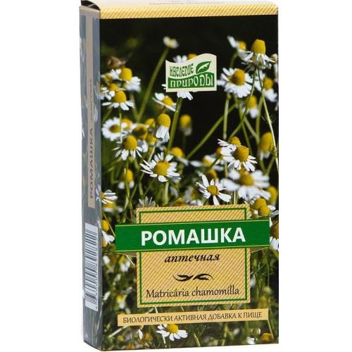 Ромашка аптечная (цветки) «Наследие природы» - биологически активная добавка к пище . Соцветия ромашки сдержат эфирное масло, состоящего из основного биологически активного вещества – хамазулена, его предшественника – прохамазулена и других монотерпенов и сесквитерпенов. В цветках растения содержатся флавоноиды, кумарины, ситостерин, холин, каротин, аскорбиновая кислота, изовалериановая и другие органические кислоты и полисахариды. Влияние препаратов ромашки на организм обусловлено комплексом фармакологических свойств, содержащихся в растении физиологически активных веществ (эфирное масло, азулен, флавоноиды, полисахариды, витамины и др.) Препараты ромашки оказывают спазмолитическое, противовоспалительное, антисептическое, седативное и некоторое обезболивающее действие.Показания к применению