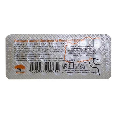 Масло растительное (подсолнечное или кукурузное, или соевое, или оливковое), оболочка капсулы (желатин, глицерол, консервант метилпарагидроксибензоат Е 218, краситель желтый хинолиновый Е 104, краситель индигокармин Е 132), ретинола ацетат (витамин А) 3300 МЕ.