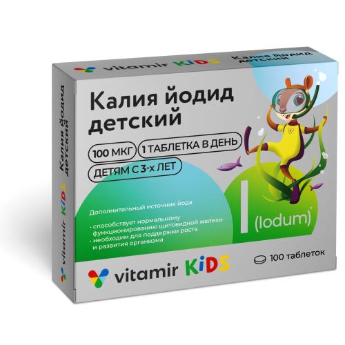 Йодид калия применяется при: • йоддефицитных заболеваниях щитовидной железы; • предотвращении поглощения щитовидной железой радиоактивного йода; • воспалительных заболеваниях верхних дыхательных путей; • в офтальмологии; • в стоматологии; Для Вашего удобства «Калия йодид 100 ВИТАМИР® детский» упакован так, что одна таблетка имеет высокое содержание элементарного йода, достаточное, чтобы восполнить суточную потребность в нем детского организма. Суточная доза (1 таблетка) содержит: Йод, мкг - 100,0 % от рекомендуемой суточной потребности * Дети 3-7 лет - 100 мкг Дети 7-11 лет - 83 мкг Дети 11-14 лет мальчики - 77 мкг девочки - 67 мкг Дети 14-18 лет юноши - 67 мкг девушки - 67 мкгПротивопоказания