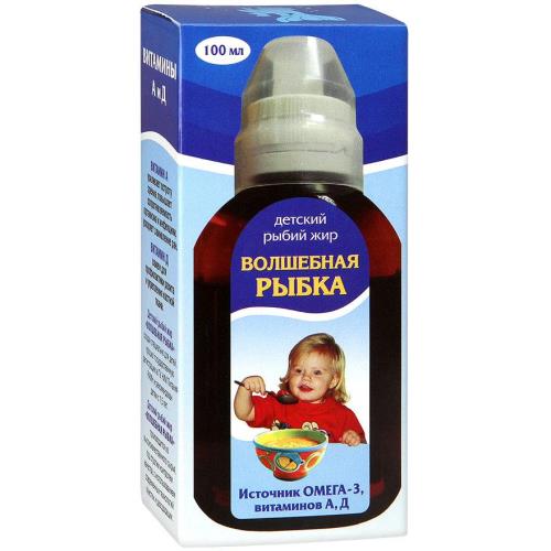 Биоактивная добавка «Золотая рыбка» для детей содержит 100-процентный очищенный рыбий жир, содержащий витамины А и D.