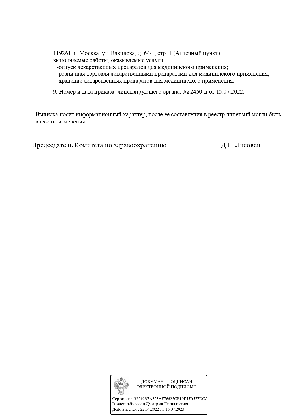 Выписка из реестра лицензий ООО МИРФАРМ (лист 2)